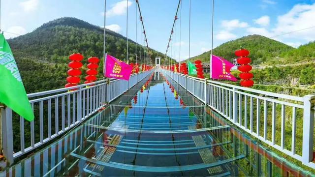 九真山9D玻璃橋:為三跨地錨式懸索橋,橋面寬2.6米,橋面高約127米。該橋采用超現(xiàn)實(shí)視覺(jué)感受,配以特殊刺激效果同步表現(xiàn),以仿真場(chǎng)景與特別感應(yīng)設(shè)置,模擬多種特技效果、立體畫面、驚險(xiǎn)劇情與互動(dòng)游戲,將視覺(jué)、聽(tīng)覺(jué)、觸覺(jué)和動(dòng)感完美地融為一體,使廣大游客全身心地融入九真山驚心動(dòng)魄冒險(xiǎn)旅行的無(wú)盡魅韻之中。